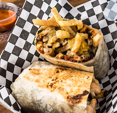 California, Fries, Carne Asada, Cheese, Chipotle Crema, Salsa Roja